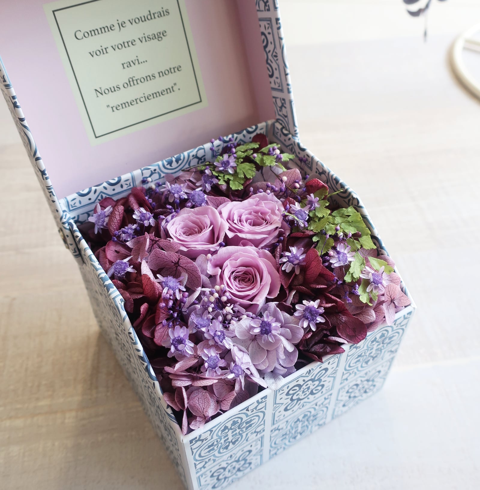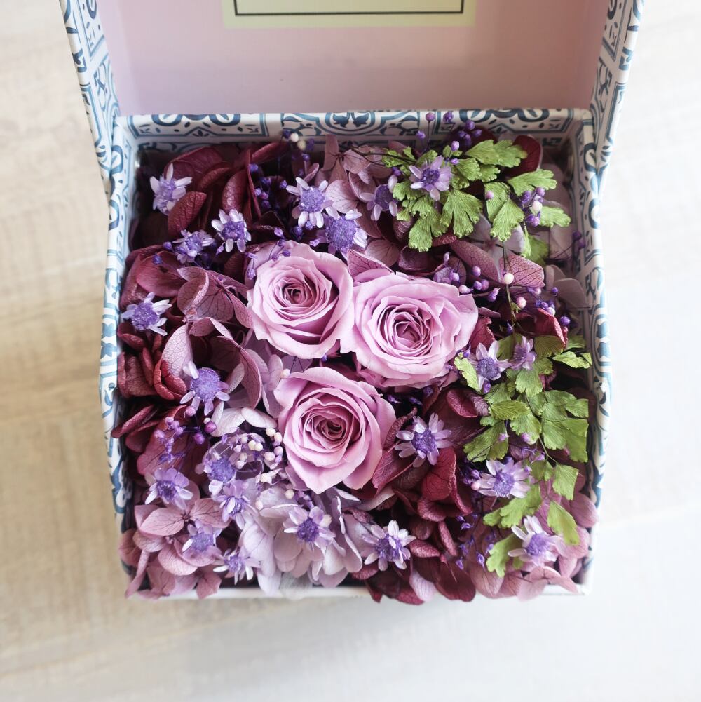箱の中にプリザーブドBOXフラワーアレンジメントとして閉じ込めました。