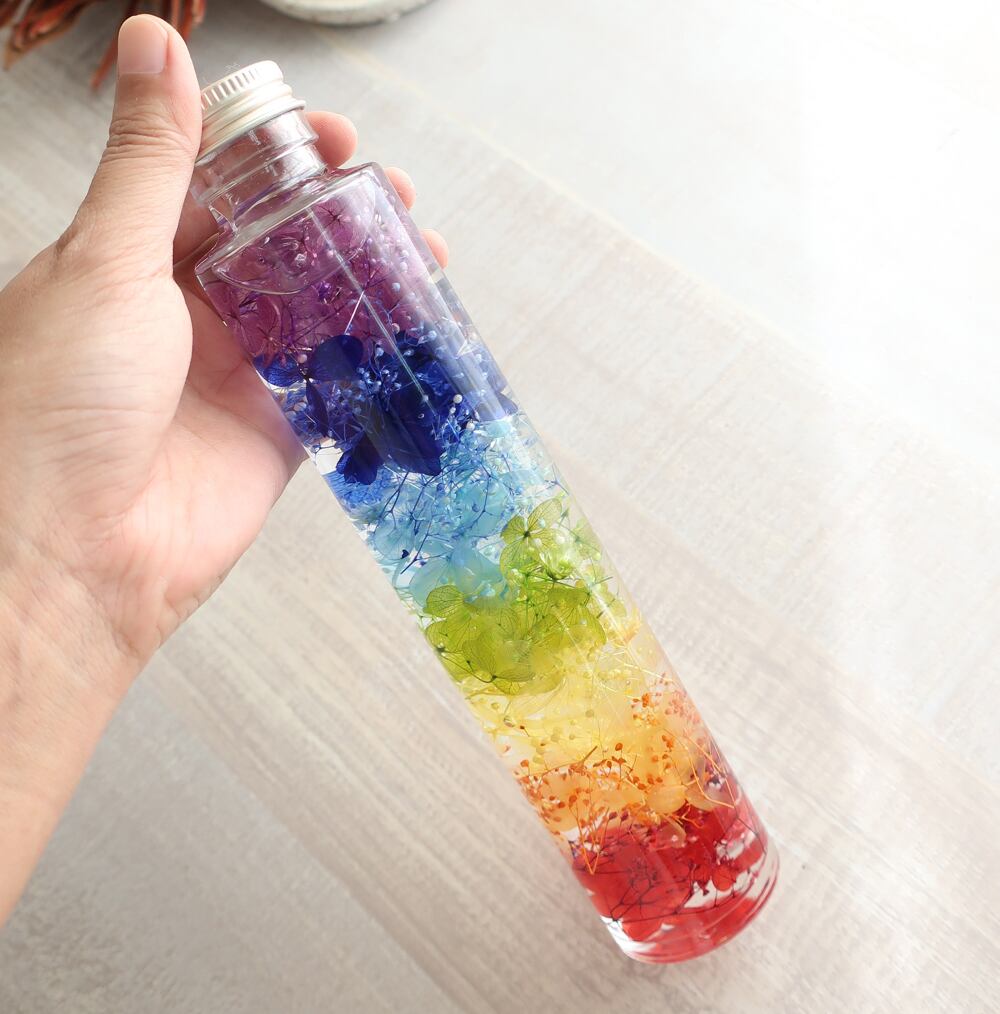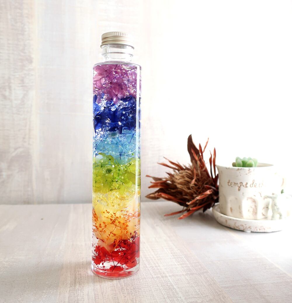 高さのあるガラス瓶に虹色の7色グラデーションを表現しました。
