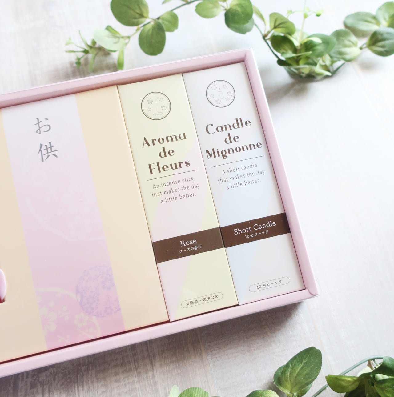 ローズのお線香&10分ロウソクセットのお供え物です。