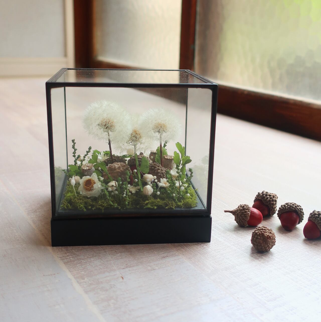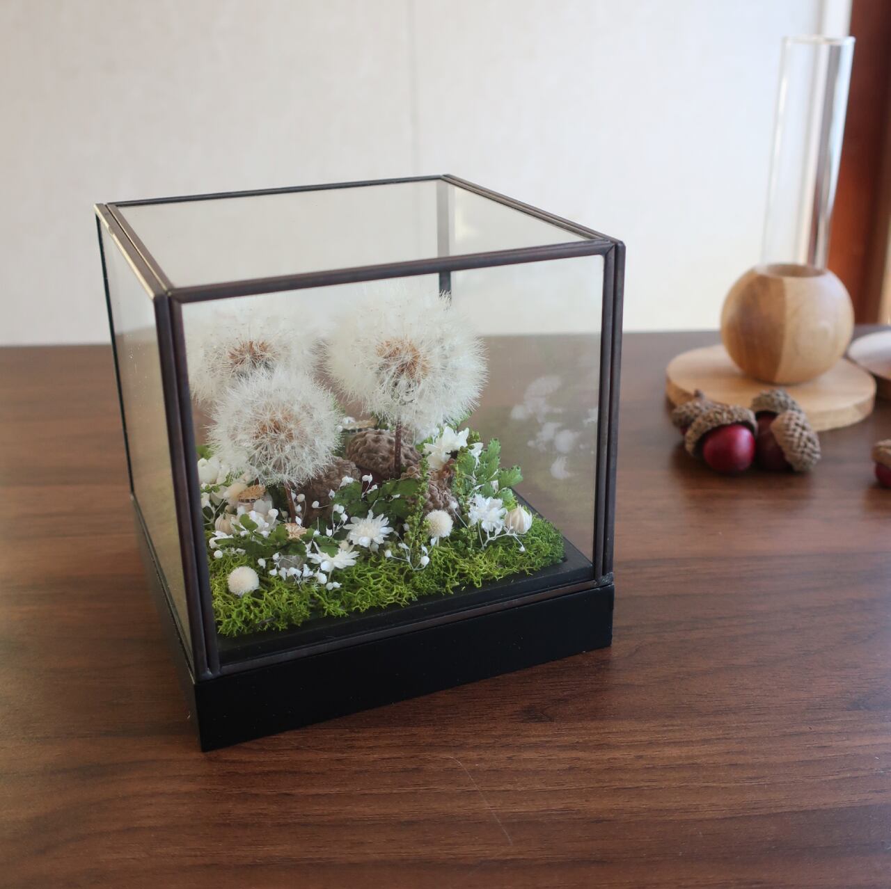 タンポポのドライフラワーと白小花、どんぐりのちいさなちいさな庭景色。