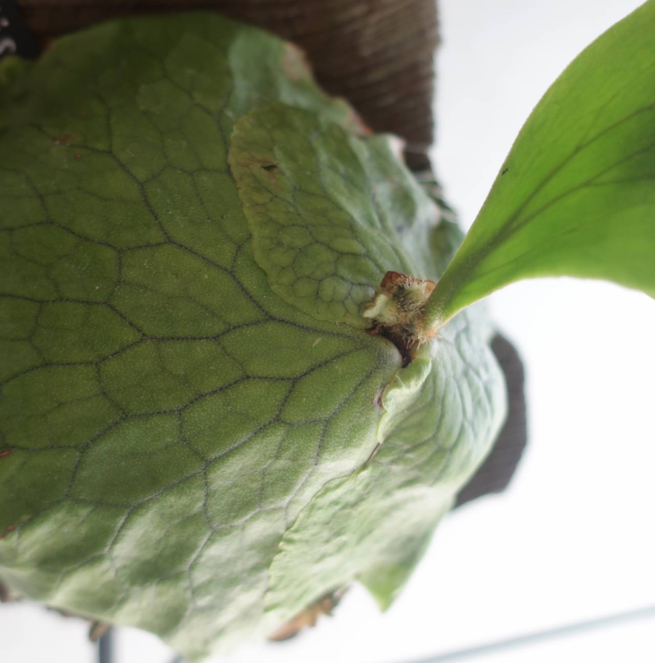 マダガスカリエンセ譲りの葉脈が浮き出る貯水葉、艶のある胞子葉が特徴です。